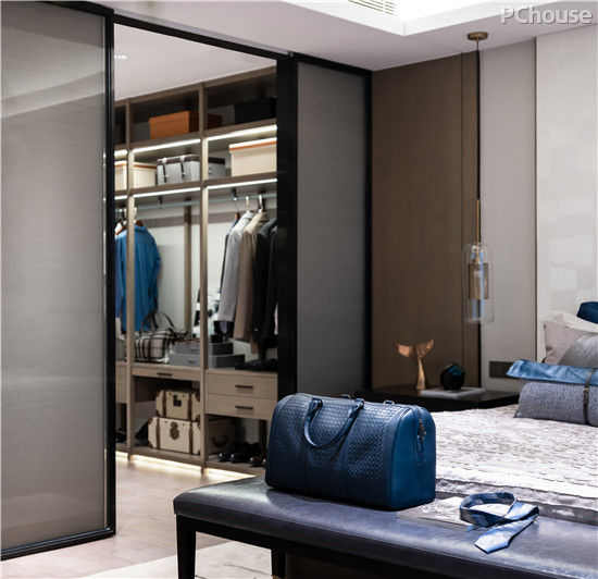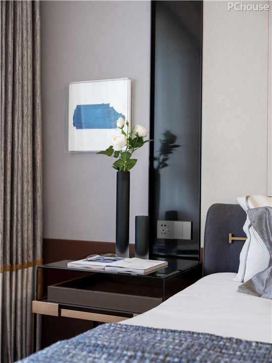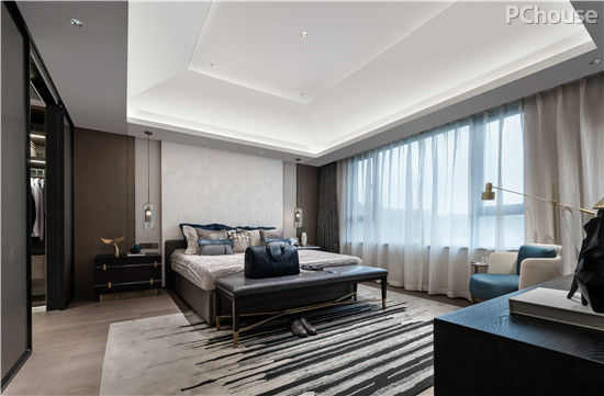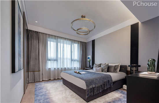 主卧室沉稳的色调点缀古铜镶嵌,呈现出高品质生活的气息。兼顾使用和舒适性的质感家居、地毯等,淡雅的蓝色搭配,塑造了别样的居住美感。