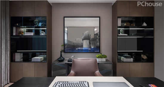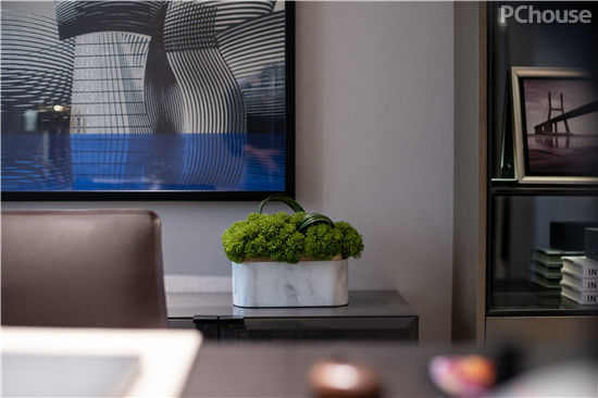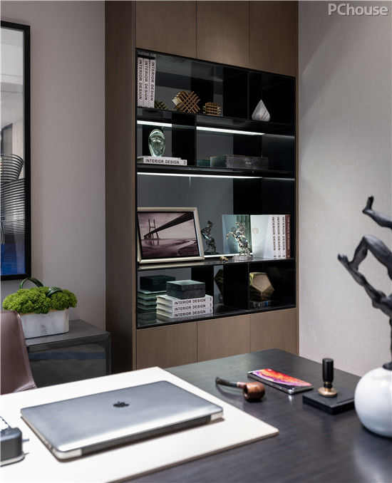 书房装饰品,在光、色的配合中,十分具有艺术魅力和人文温度,家私与精致艺术品和谐搭配,让人联想到主人的精神与气韵。墙面抽象装饰画,与场域虚实交融,无形中令空间扩容。