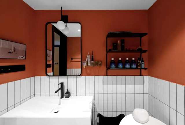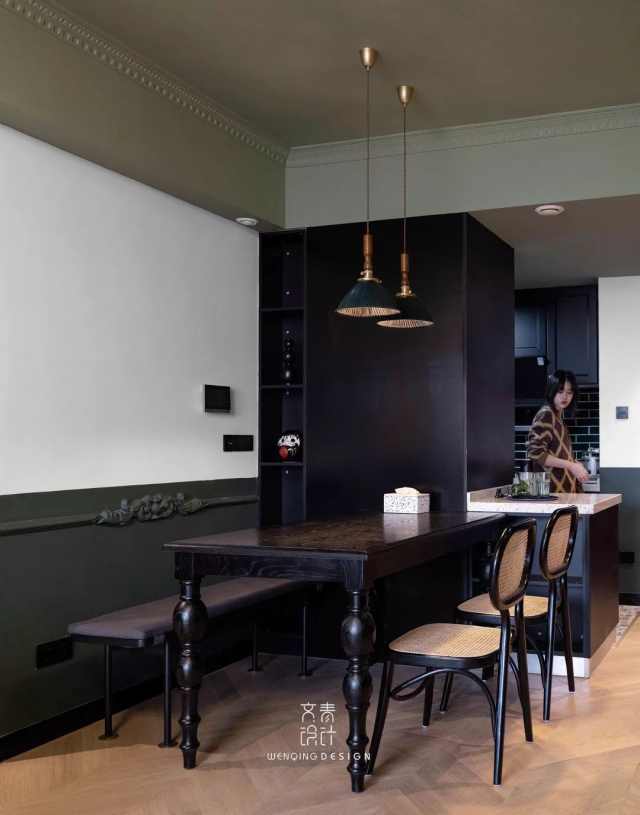 墨绿和姜黄的撞色复古而典雅,吊顶的薄荷绿又给人宁静的感觉,众多色彩的碰撞,就跟生活一样,每天都在用全新的面貌去迎接新的一天。内卫运用了作为最复古又潮流的大地红,并用百搭黑白两色来平衡,古今的切换就是这么自由。