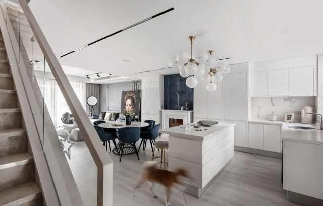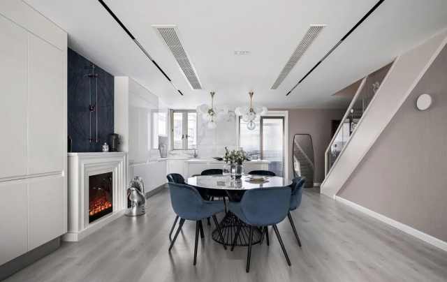 以现代框架为主题,融入优雅浪漫的精致线条,色彩选用经典的丹宁蓝和爵士白相映衬,多种材质肌理间的碰撞融合以及多层次的灯光铺陈,整个家既有时尚的轻奢质感,又有时光打磨后的稳持优雅。