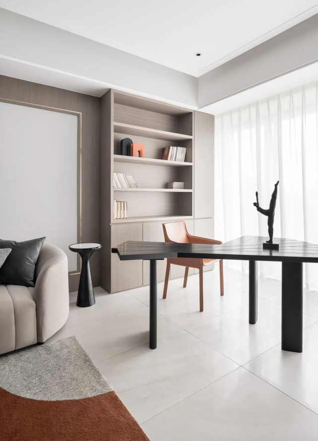 通过开放厨房加入岛台的方式,增进家人间交流;并通过合并两个卫生间,让舒适感倍增;更取消一间卧室,将独立又能开放的书房纳入主卧室,形成一个类似酒店套间的复合型功能空间,生活品质感更强。