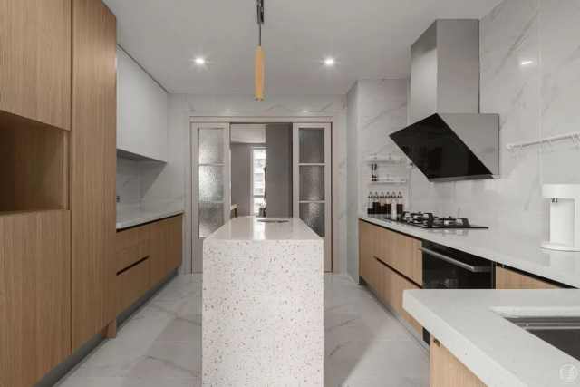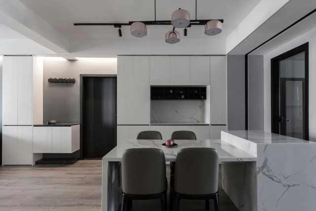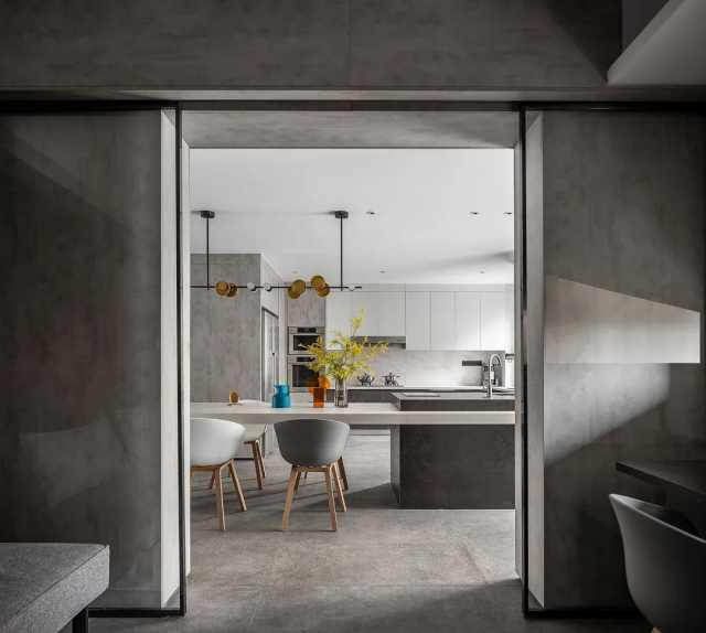 设计师以灰色为主,并用同色系不同材质,以及材质本身的纹理,饱和度比例来调和空间层次,达到整个空间的丰富性。同时,业主非常喜爱美食,一个可以用于社交和展示厨艺的空间,同样必不可少。