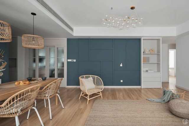 以原木色的地板、餐桌,竹木编织的藤编灯罩,草编的褐灰色地毯,浅灰色的棉麻沙发、秋千吊椅等划分出就餐区域、活动休闲以及亲子区域。白色纱帘在宁静、自然的基础氛围上赋予有限空间一丝轻快感。蓝灰色的跳色以及花样多变的家居饰品,恰到好处地将原本安静怡然的空间变得浪漫、多情、活泼。