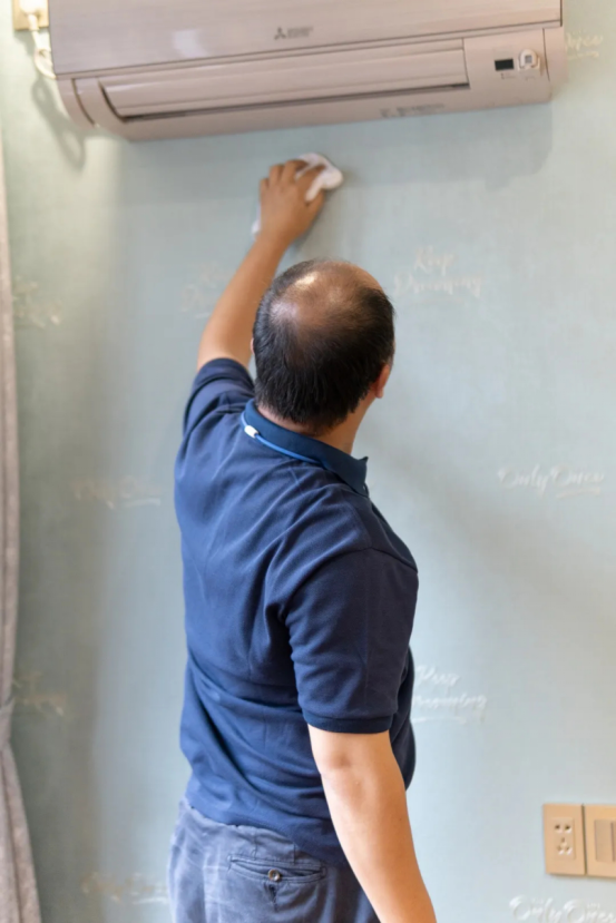 孟总用心护理墙布,一边仔细检查墙布,一边细心将污渍、灰尘等去除。