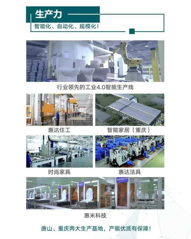 产品:智能卫浴、马桶、五金花洒、浴室柜等全系列卫浴产品,陶瓷砖和装配式整体卫浴等。
