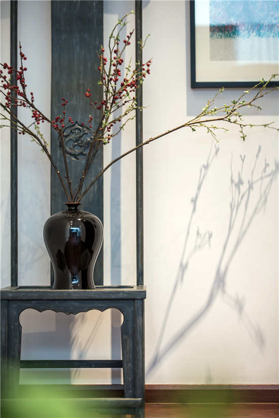 在这一方天地,扇扇浅木质屏风,将明亮的光线过滤成斑驳阑珊的光影;古朴的深口大缸,在轻盈空间中压下深沉的一笔,将视觉焦点和气场浓缩凝聚在中央。古董雕塑肃穆而立,铁艺灯笼墙边低挂;乌木层叠秩序井然,绿意葱葱点缀其中。深藤浅麻,交织成趣;灰石青砖,古而不拙。这一切使得室内的空间丰富且多元化,层叠的人文意象,在方圆之间勾勒出空间里的袅袅禅意,予人一种回归的心境。