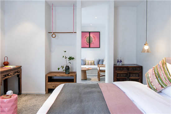 室内设计保留部分老木质材料及裸露粗犷的木结构,让人感受岁月在其身上流逝的痕迹。在软装上规避过多杂饰与设色,气质温婉的绣花抱枕、陶罐花艺、白瓷茶具等单品装点于干净清雅的空间中,时间的步伐在这般细腻与温柔中看似也慢了下来,营造轻抚人心的情境感。