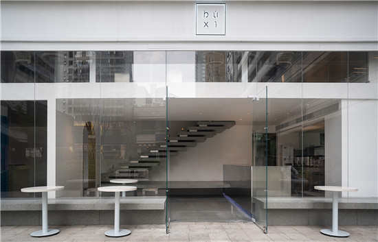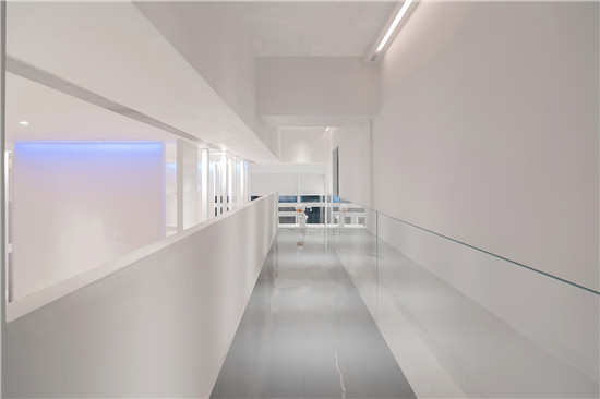 一层是花店咖啡与酒吧,艺术品位于墙体特意让出的主位,穿插连接于各个几何空间。二层为画廊与大型的艺术品展示区域。值得一说的是楼梯间在空间中是特殊的存在,作为垂直交通的功能组件,它直接联立其楼层的转换,打开楼板插入在空间中,突破循规蹈矩的秩序。交通的专属特性,给予了它流动性,与空间的几何体块带来的静谧形成对比。