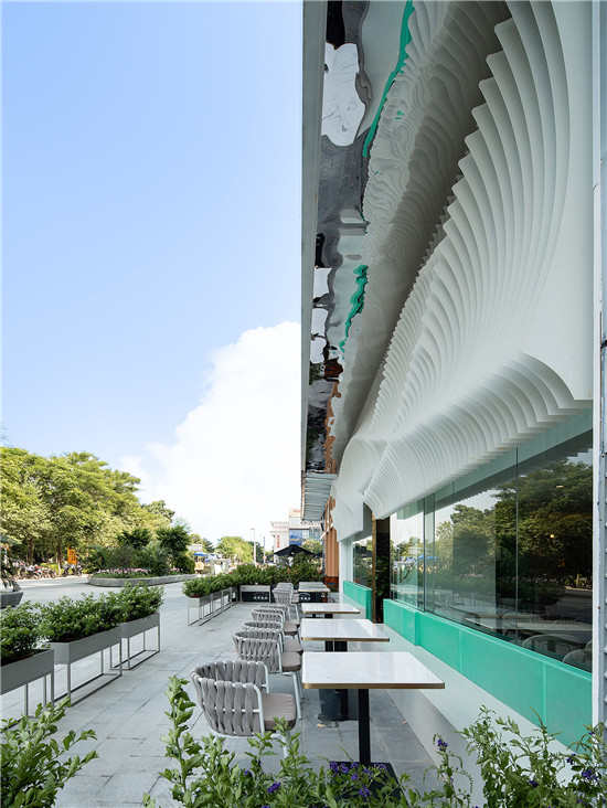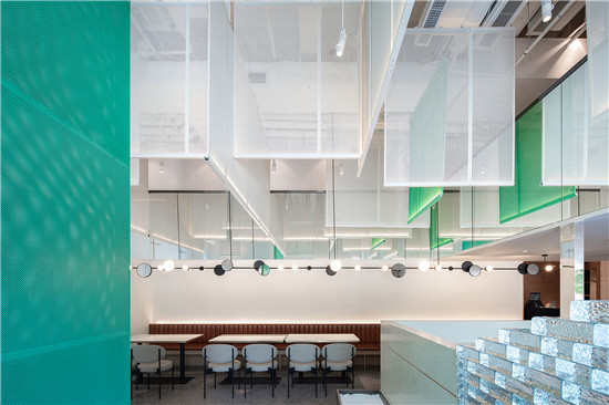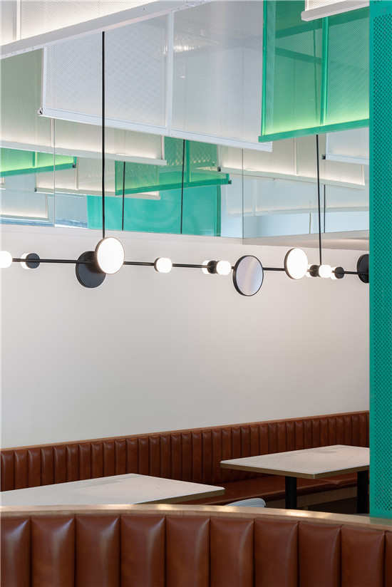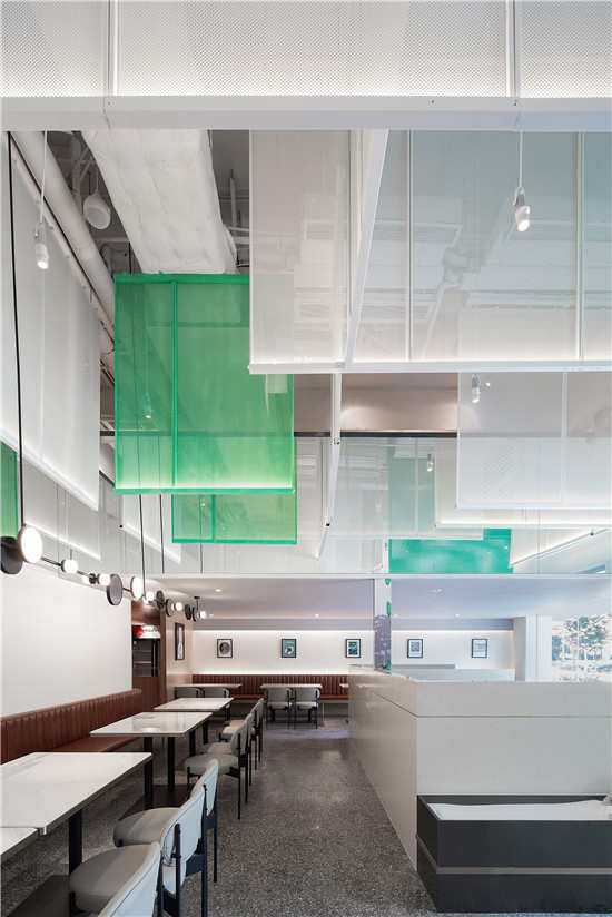 设计师采用穿孔板使“片”呈现半透明的性质,尽可能地拉远二层的视野,并为其带来了一种朦胧感与视线上的层次性。也因为“片”的阻碍,使得一二层视线交汇在了这些由半透明“片”组成的混沌空间,一二层的食客由于视角的不同具有了差异性的空间体验。