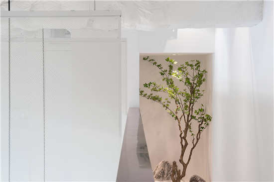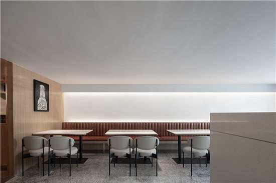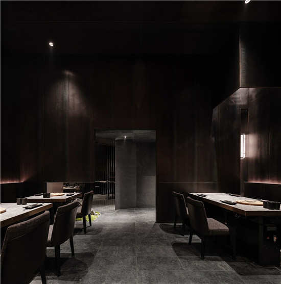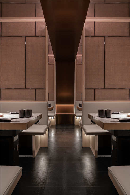 灰石矮墙的序幕拉开,布置着景深幽邃的客座群落;环顾四周,温暖的木质基调搭配带有肌理的白墙,低调而又沉静。悬空的半面白墙与木桌穿插,通透中又隐约带出其后的层层景致,完成多层次的婉转划分,含蓄而又清晰。环环相扣,步步皆景,大大提升了“食”的趣味与深度。因此设计师删繁就简,精心规划了动线,通过材质的对比和光线的明暗,以景中有景的起承转合,委婉阐述了“内敛”的界线概念。