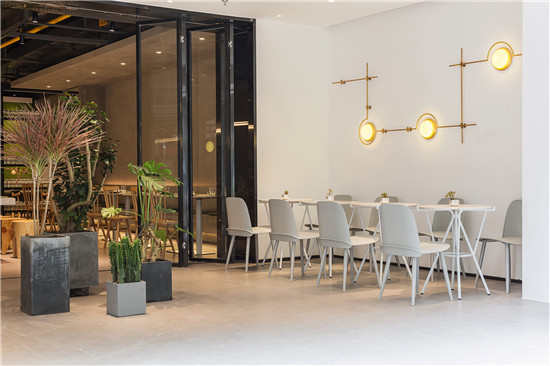 考虑到该餐厅的区位优势,其店面的两扇门分别分布在两个对角放置的方形的两条对边上,一扇面向商场,另一扇则面向街道与行人,“我们把二层的位置安排在这两个方形的交汇处。使得食客无论从哪个门进入,首先都能体验到一个规整的中空环境。”埂上设计尽可能地压缩二层的空间大小,保证一层挑空的完整,让其面向一层的部分变得通透,同时弱化隔墙来展开它视野上的大小。