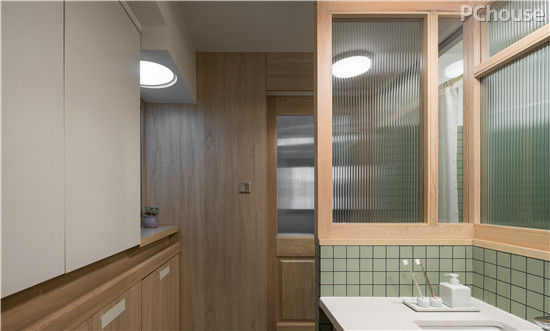 在天花板的防水性能上,设计师也选用了更加耐水的防水石膏板,用双层石膏板进行吊顶。地面的防滑性能也至关重要,在长期需要遇水的卫生间和厨房地面,设计师选用了一款有着严苛防滑标准的瓷砖产品。