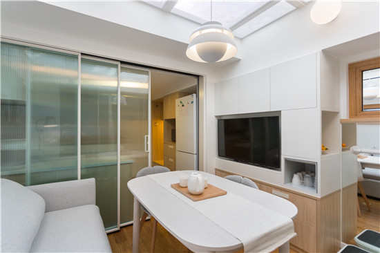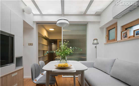 他首先对空间进行重新布局,将天井内的小平房和阳光房规划为厨房和客厅,原有的卫生间和过道餐厅则整体拓宽为父母房,卫生间放在父母房和儿子房的中间,方便小姚以后的使用动线。