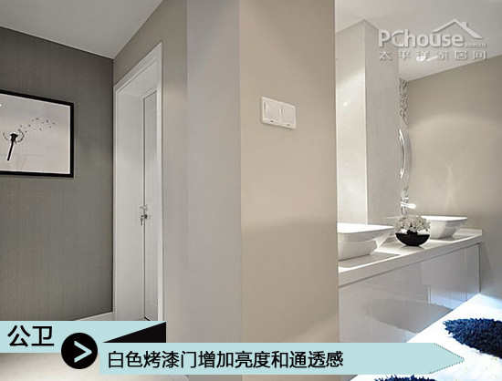 设计背景:夹于房间和玄关之间的拐角处被用作公共卫浴间,为了让狭小的空间也出彩,设计师大胆采用干湿分离法,将洗手区做成开放式,精致时尚的设计为整个客厅空间加分。