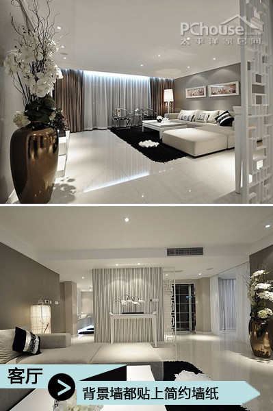 为了避免进门直入客厅的风水“漏财”说,玄关用竖条纹墙纸和镂空花隔板做成了屏风,并将花格板喷白,使白色空间显得更宽敞明亮。