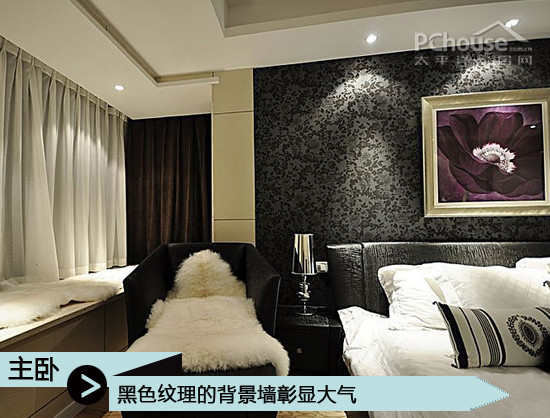 在这个私人空间中,背景墙改用颇有个性的黑色花纹,是专属于主人的大气。搭配一张铺着羊毛的皮质贵妃椅,让人联想到华贵、慵懒的空间气质。