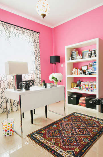 编辑点评:从白色的天花、粉红色的墙壁到黑色的灯罩、白色的花朵再到白色的书桌、民族风的地毯,错落有致的摆放,再搭配上本来就层次分明的储物柜,书房角落呈现出强烈的层次感。半透明的花瓣状图案窗帘使书房充满优雅气息。
