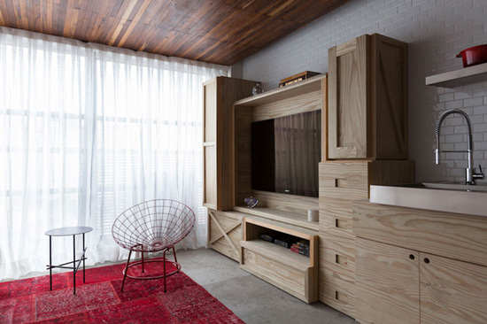 推荐理由:在周围都是暗色调的情况下,采用鲜活的一点的颜色,嵌入原木色柜子里,既增加收纳作用,又提升了周围色彩的亮度,令空间更有活力。