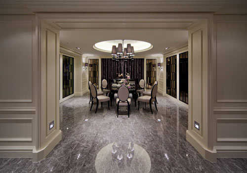 编辑点评:设定以台商为主要族群的豪宅建案,设计师谢启明以新古典氛围为轴,尺度宽敞中衬入牙白色系的暖度、加以软装深色对比,空间有了自蕴而生的器度展现。
