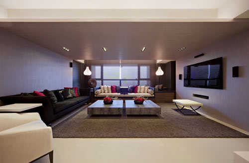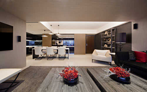 编辑点评:运用灰镜为素材的天花,镜面折射之间和缓了空间压迫度。