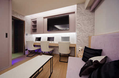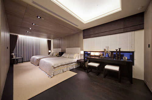 每年会短暂停留为与家族团聚的台商家庭,对于空间想法除了休憩之用外,公共场域规划更是其所在意的重点。因屋主与三千金有着极佳感情,设计师谢启明将原有的两房打通,考虑到年龄差距,三张床位以高低落差产生独立感,并创造了犹如电影院般斜坡式座位。
