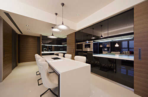 编辑点评:看似是餐厅与廊道的切割墙面,实则为收纳量体,两面向的运用让大宅不失生活实用度。