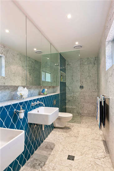 推荐理由:在长方形浴室中,安置悬空的洗手盆,让空间感觉更宽敞。