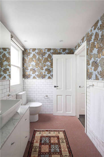 推荐理由:浴室是空气较湿润的地方,如果你喜爱用壁纸装修,在浴室中,不妨借鉴这里,只在墙面的上半部分,并且选用特殊材质的壁纸,这样打造出来的浴室空间更有层次感。