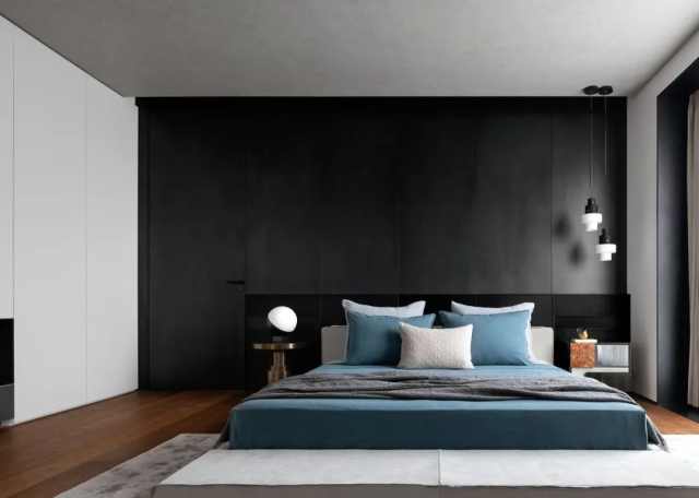 豪宅之所以“豪”,非但在于“大”,丰富的细节亦理应值得考究。主卧在点线面的排布中有着熟稔自如的转换,在黑白灰的围合中饱含深情。床头采用方磊惯用的三角构成手法,既打破对称式单调,又构成了入室的视觉落点。所选取的灯饰本身也渗透着设计师的精巧心思,与卧室浑然相融,增添一抹柔情的点睛之笔。
