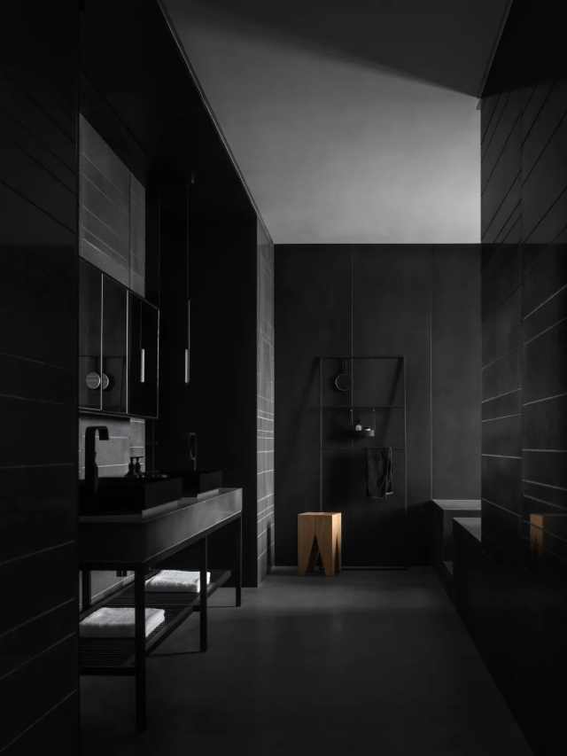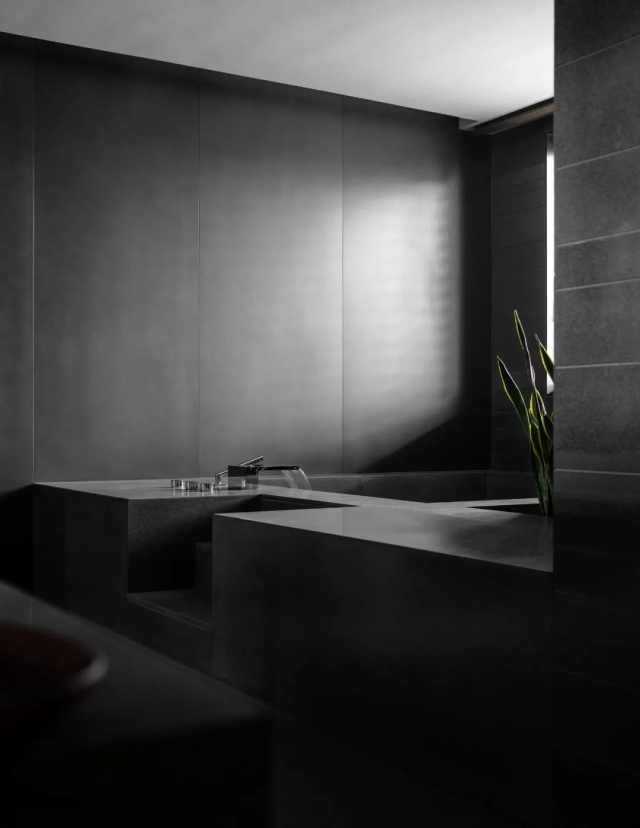 偌大的主卫内,设计师精准推敲比例尺度,充分照顾每一寸的室内感受、构图审美、细节质感等,通过石材清晰的线条、隐约的纹理,笼罩出一种包容之感,暗黑中的优雅,愈发显得意味悠长。