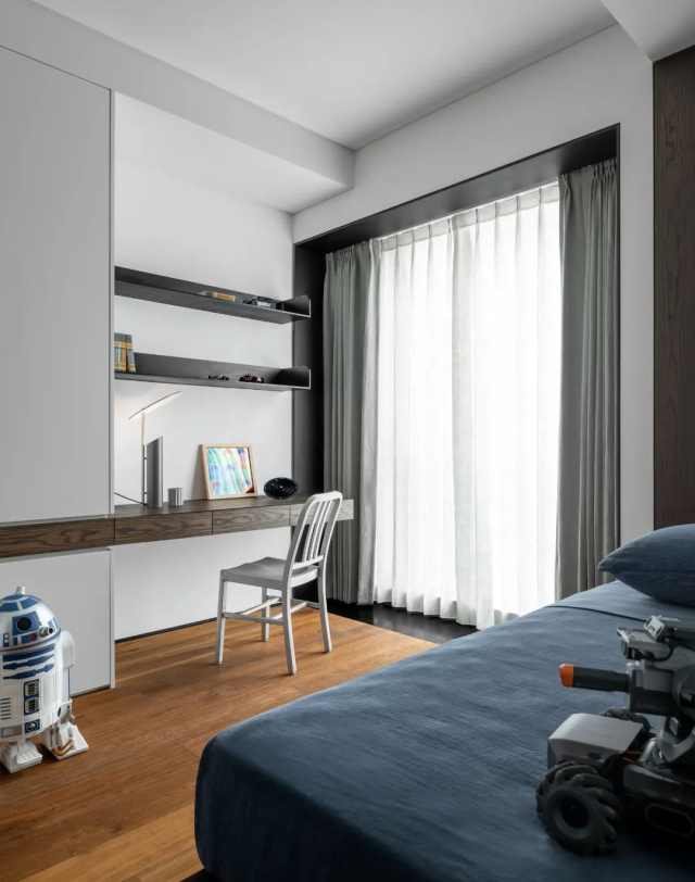 起居室另一头则是两位小主人的独立卧室,依照兄弟俩的爱好和需求,既有共性之处,又各具特色。其中一间卧室内特别定制的上下床,也为满足兄弟俩一起玩耍、陪伴入眠创造了条件。