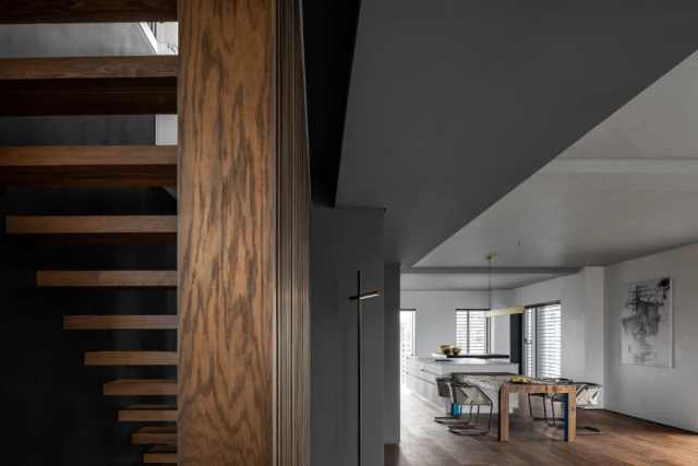 楼梯的位置经过设计师多次反复调整,基于整体布局,以及对横向、垂直枢纽便捷性的把握,最终确立其所在。木质踏步的镂空排列,呈现轻盈的悬浮感,又顺畅的将光照引入,材质的应用在冷暖调和中也显得刚柔相济。![]()