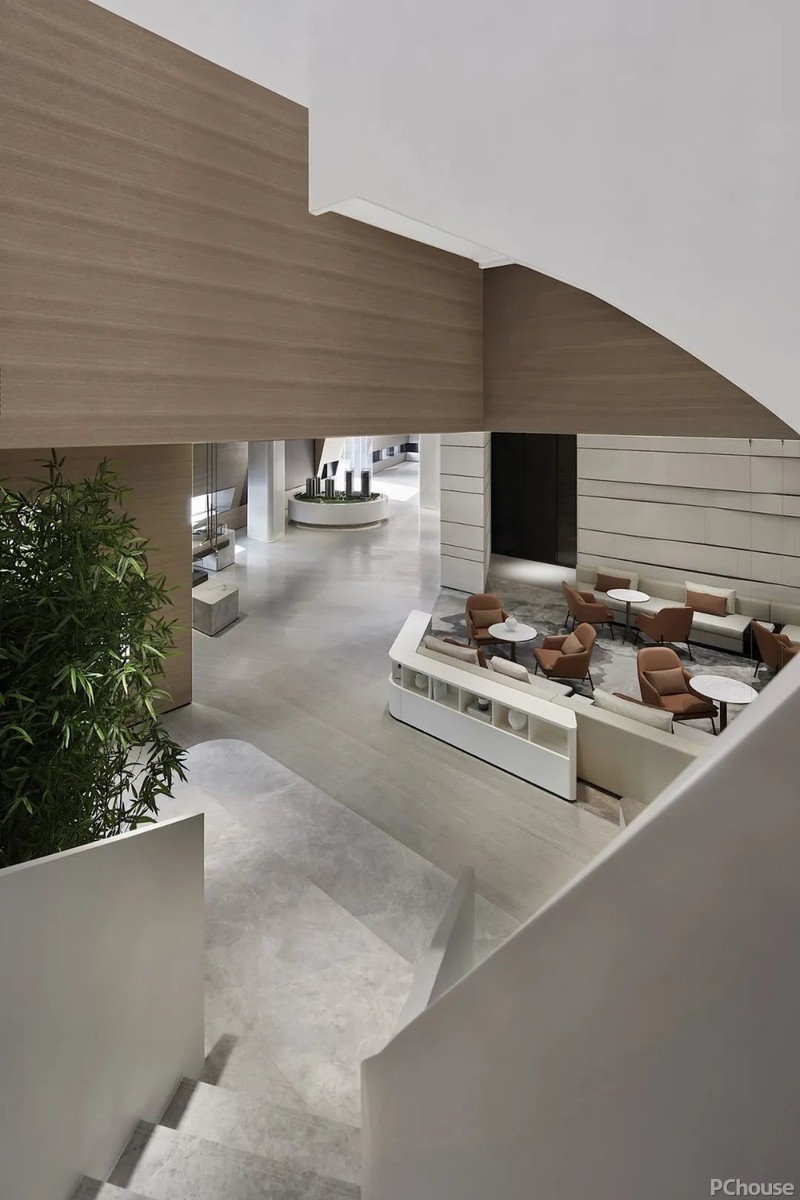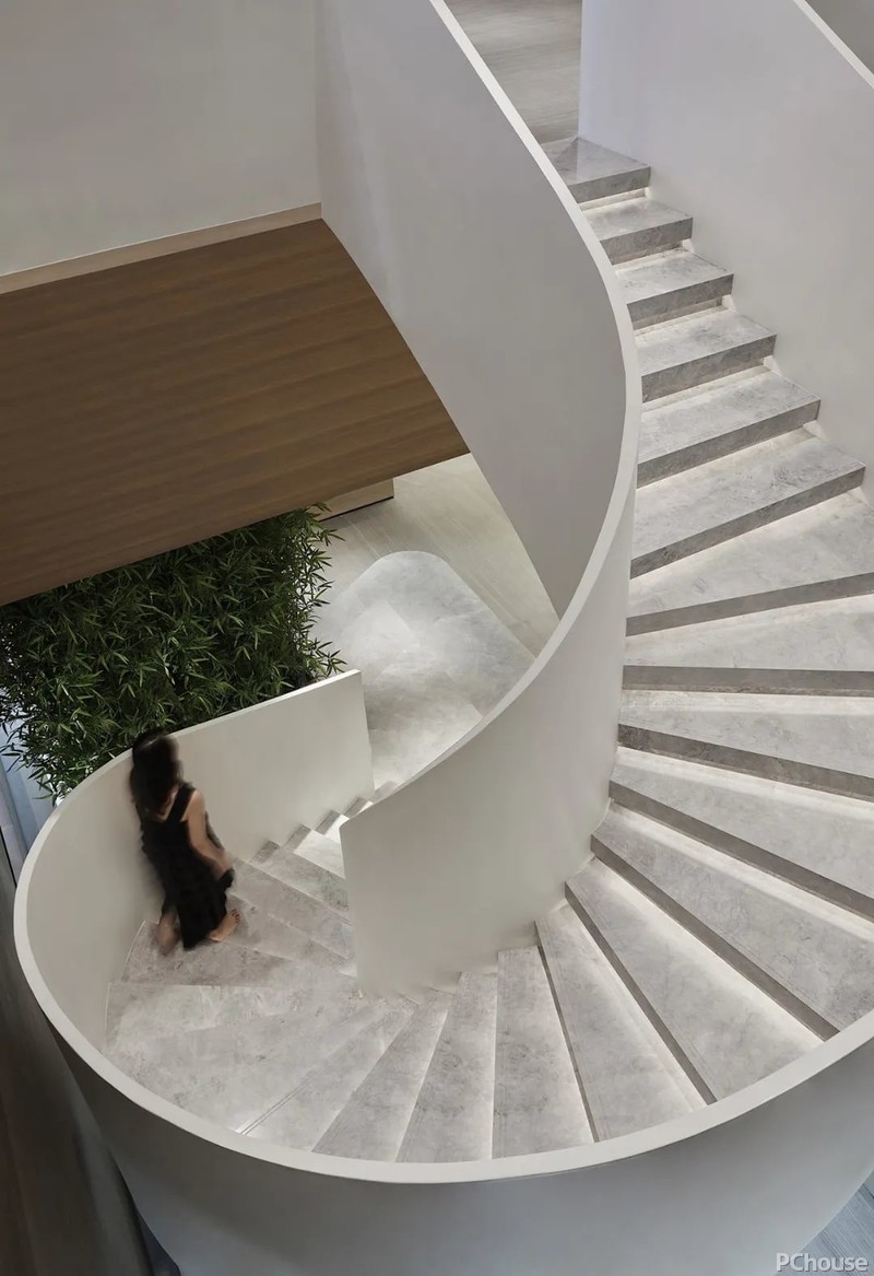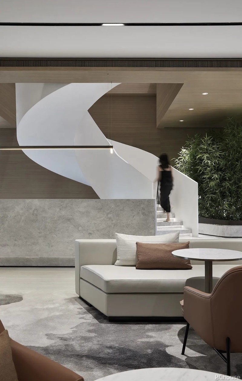 旋转楼梯优美雅致,带来一股柔和的张力,既拓展了层次关系,又给访客带来视角上的多重转变。