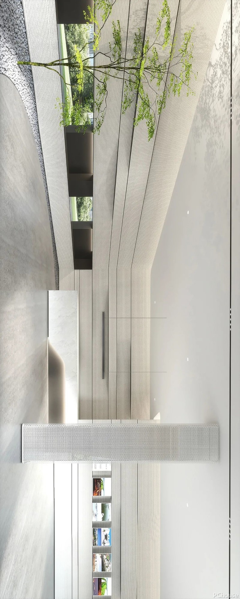 另一侧则由斜切式的木饰面包裹而成,将窗口位置适当下移,自然光于此洒入,呼吸感倍增。此外,这也是对建筑场地特征的一种设计回应,以期过滤掉临街的喧嚣嘈杂,以一种微妙含蓄的方式建构起内外连接。