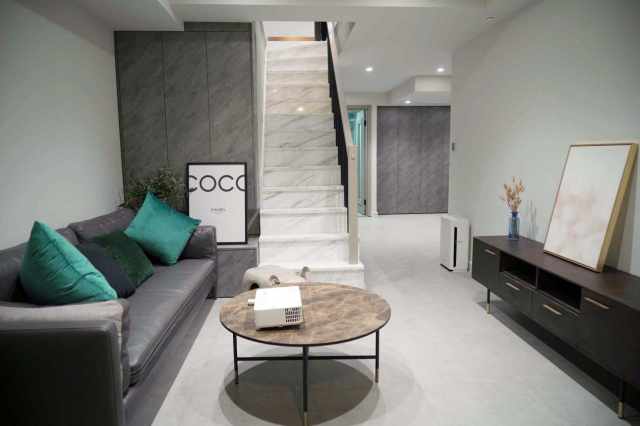 爵士白的楼梯将上下两层空间连接起来,而负一层的浅色地板也和楼梯作了呼应。设计师为负一楼保留了一个完整的起居空间,安装了明基投影仪,在大量留白的前提下,使其成为一个影音娱乐间。