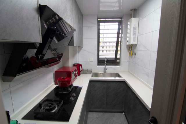 黄医生家的厨房被改造成了U字型,灰色和白色的橱柜组合是又一处经典配色,灶区和备菜区的设计也在合理范围,并且选了好用的大单槽。