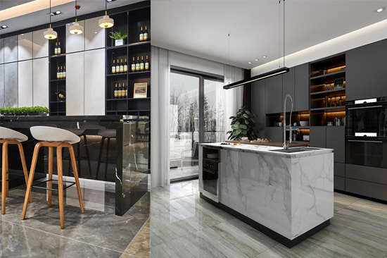 岛台:将经典的黑白配色大板融合在了餐厅里,搭配木色家具及装饰绿植,餐厅既具备了空间本身的功能性,也增加了愉悦、舒适的社交区域。瞧,陶瓷大板跨界实现得不仅是空间的装饰美观性,更使我们的居家生活充满情调和温度!