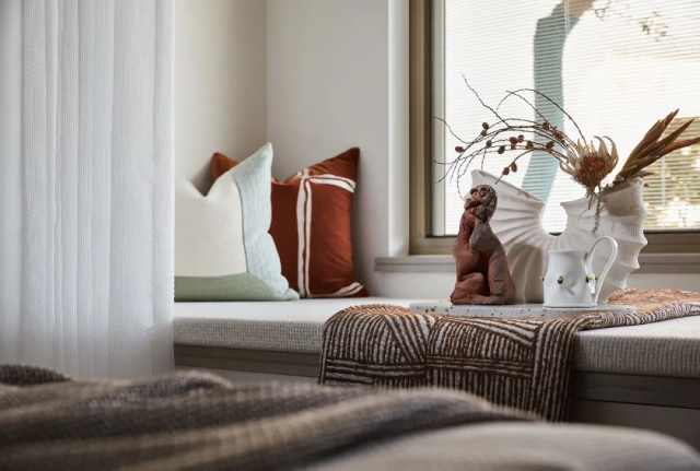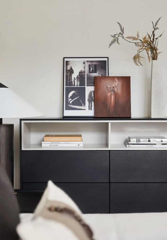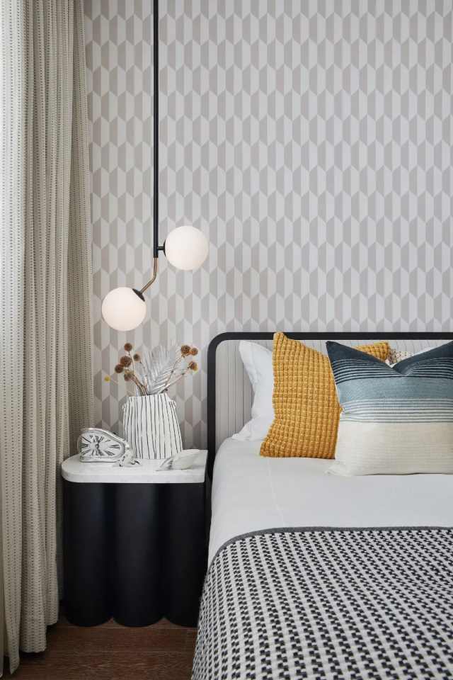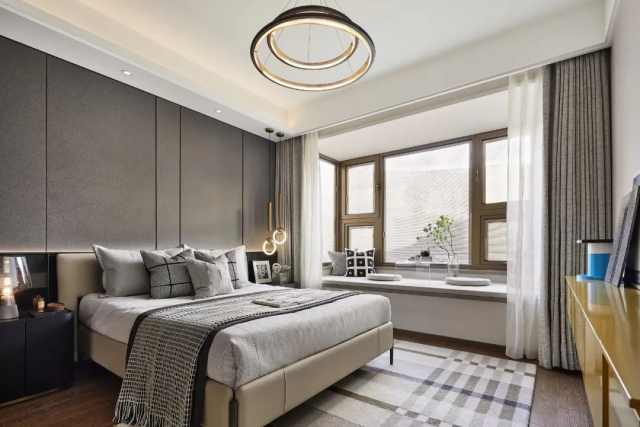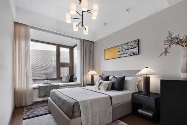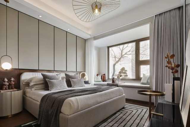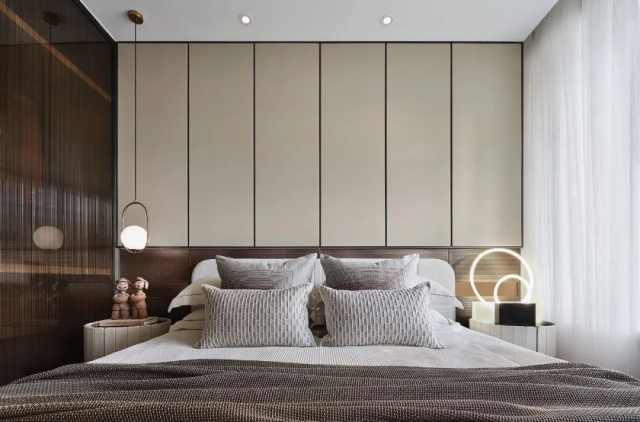 次卧删繁就简,干净利落,回归到居住本身,让各个元素能协调一致,创造出静谧安宁的氛围。