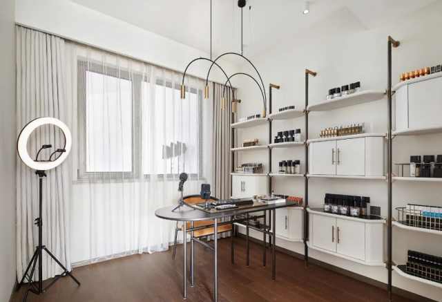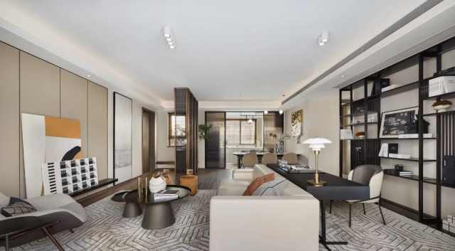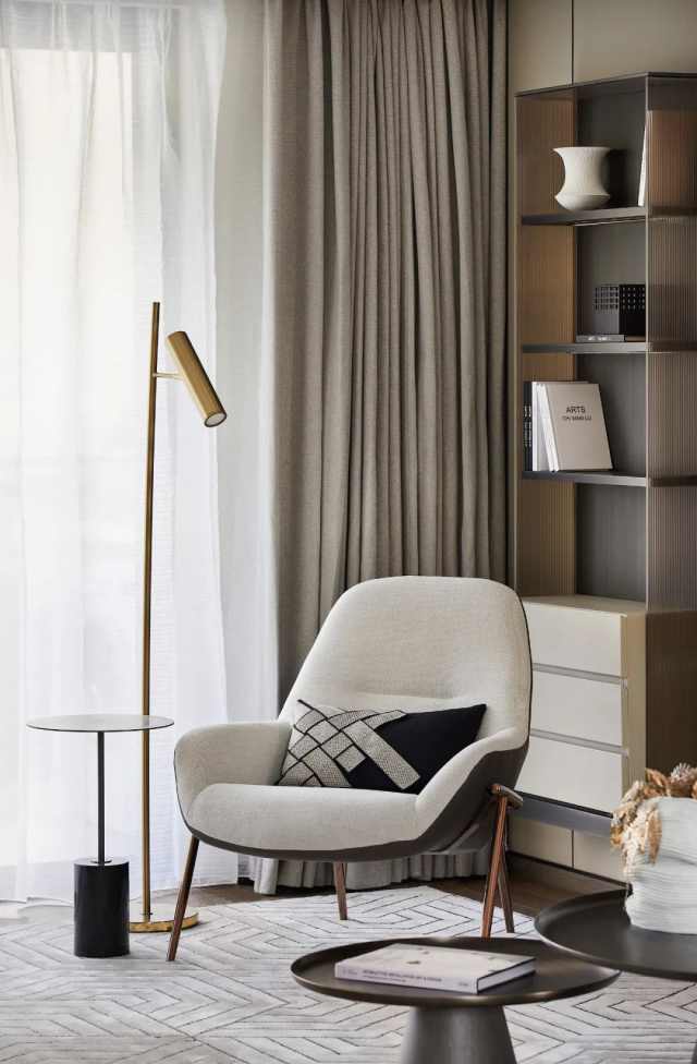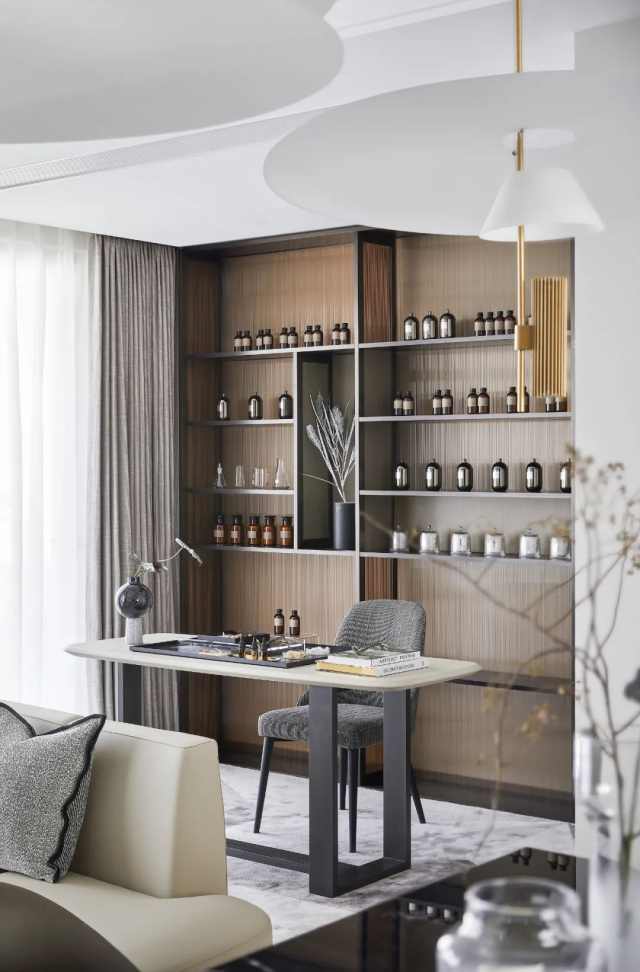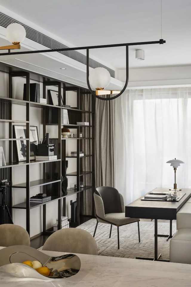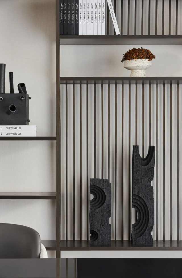 书写区则退居后方,以开放式打破单一调性,格架造型大气简约,在规整的秩序之下,又让低奢与感性于不经意间传达至每一处。