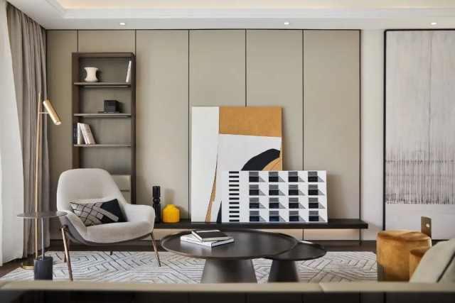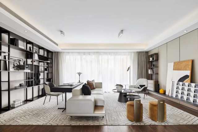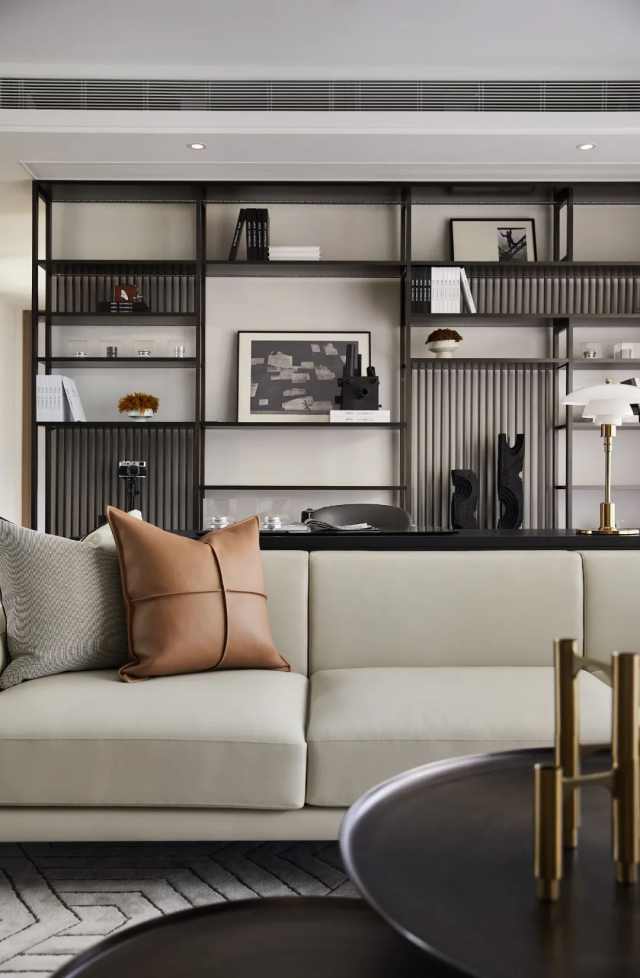 南北双向采光,延伸视觉观感,更显随性自在。皮革硬包的背景墙与一体而上的格架相望而设,书写区置于客厅之后,高低起伏,虚实错落。
