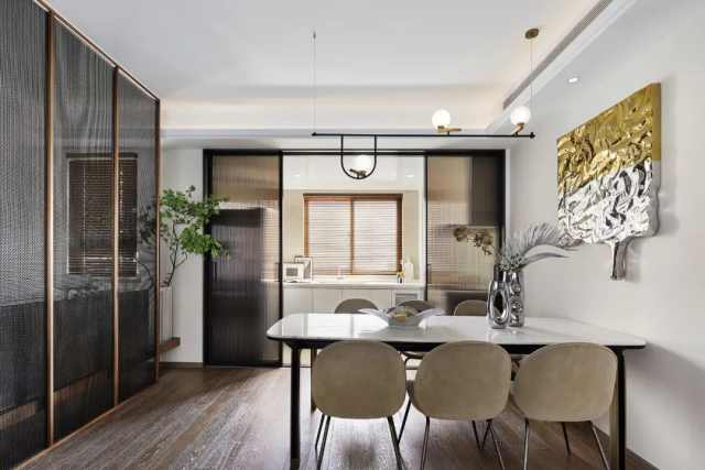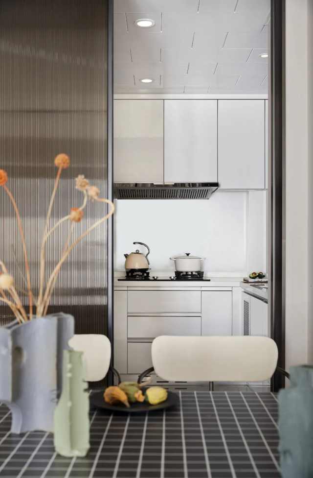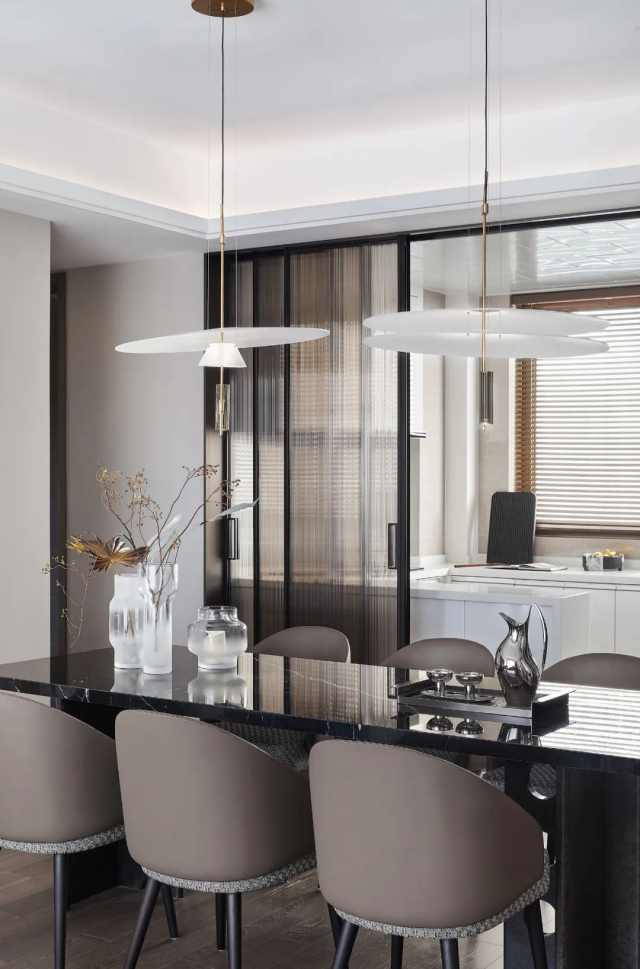 精巧的选材、用色在餐厨区也得以延续,又在轻重、明暗、深浅有别中,形成反差对比。此外,塑造美观的同时还注重强调日常细节,并以玻璃移门的开合之道勾勒出满满的品质感与仪式感。