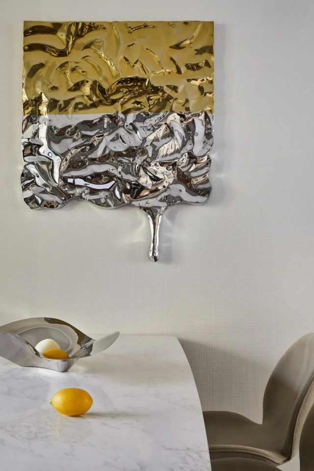 客厅以弧度的沙发和茶几渲染轻松气氛,背景墙通过金属条进行韵律划分,配合画作,呈现方正与圆弧的碰撞之美,这也是一种刚柔兼济的均衡。