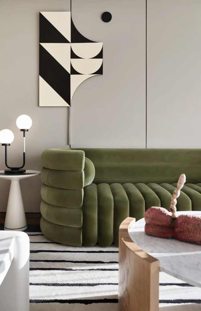 区别于以往的会客模式,当代客厅更加注重人的情感接收与表达。客厅避开了方正转角,采用包裹状的、动态的陈设,以一种随性的维度诠释别样的体验与愉悦。