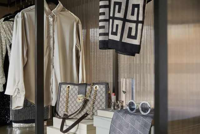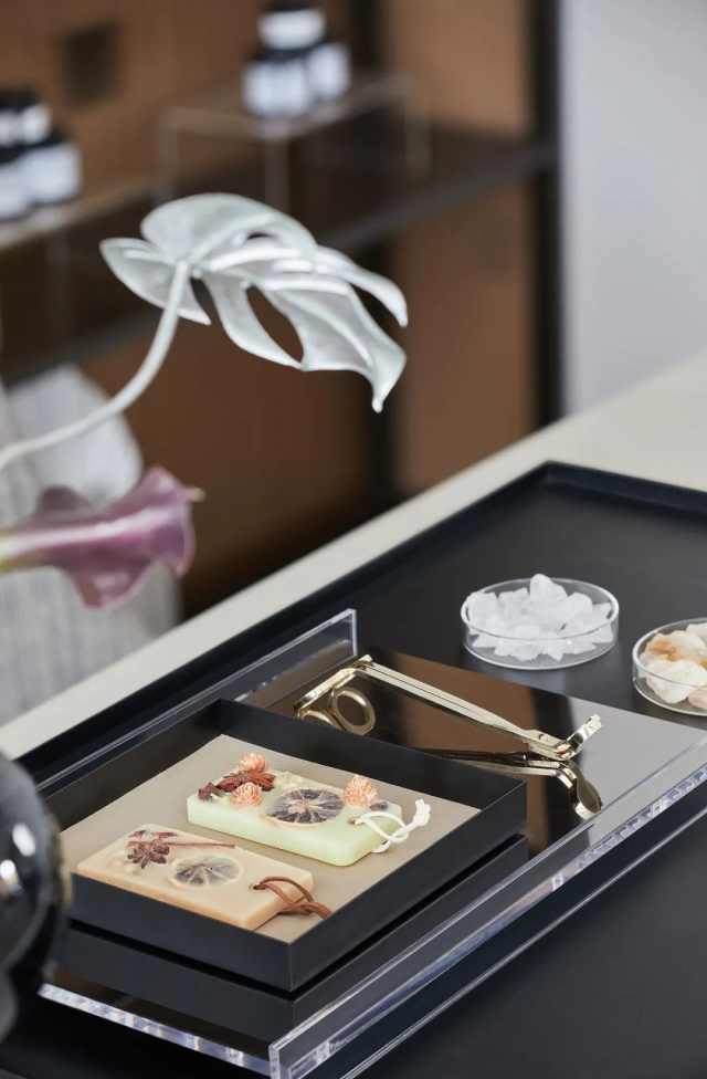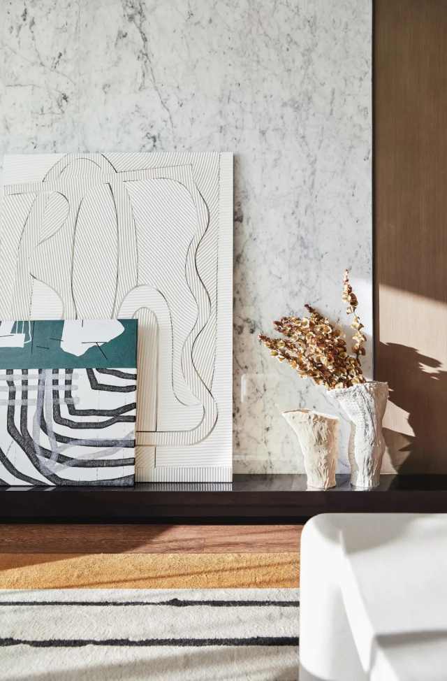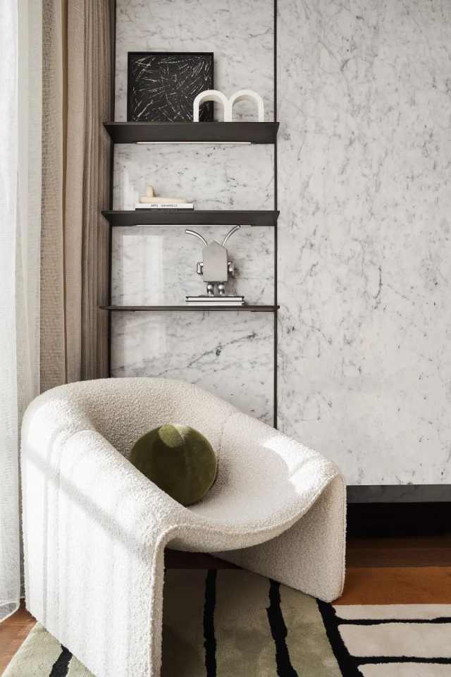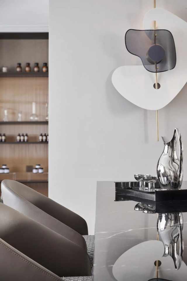 背景墙由木饰面到石材的转变,也意味着场所的步步深入。同时将金属板嵌入,极具特色的置物格架亦由此而生。多种材料的冷暖调和,在色彩与几何元素的融合碰撞中,构筑优雅格调。