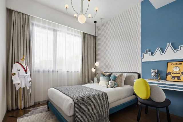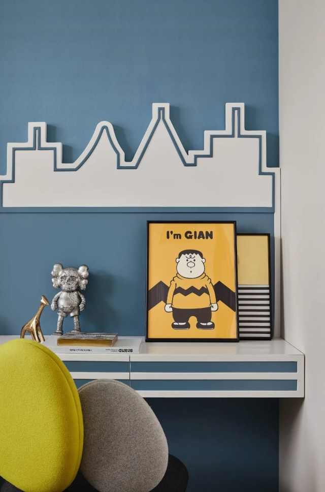 儿童房在遵循简约的原则下,又要顺应孩童天性,统筹色泽、形状、搭配,同时又让动漫、运动主题相伴相融,勾勒出一个可达成丰富感知的私属基地。