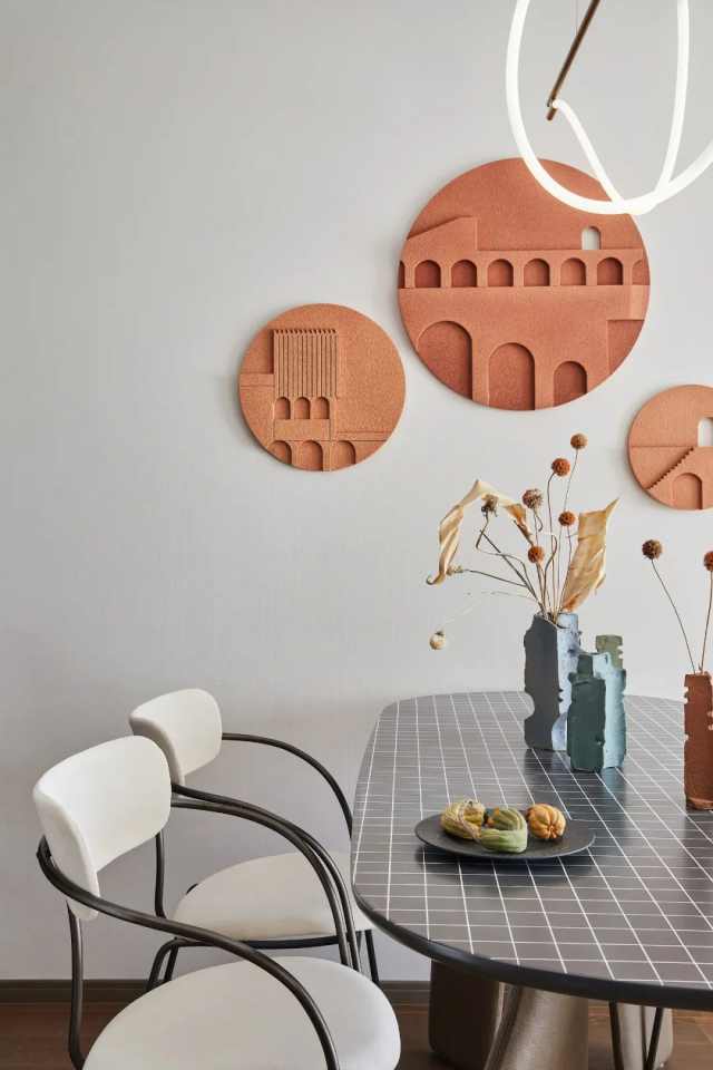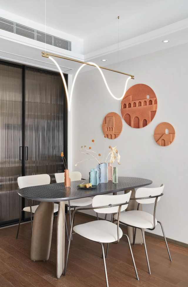 为贯彻设计语言的流动性和连续性,客餐厅与书写区有序联合。其中也不乏跳色手法、材质碰撞、比例拿捏的适宜穿插,让整体更具张力。