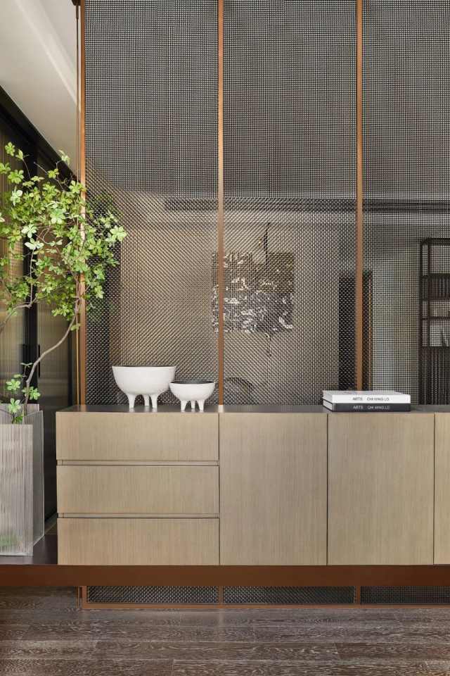 归家一瞬,别样的情趣与体贴便扑面而来。金属网屏风与柜体的组合,以自成一景的姿态,隔而不断,通透与私密并存,功用与美感兼具。隐约间目光亦可探向室内,意味悠长。