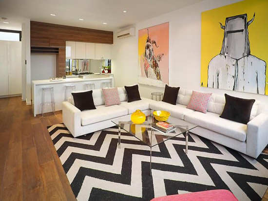 编辑点评:充满立体感和线条感的黑白条纹地毯划出客厅空间,白色的沙发自然地融入整体,玻璃桌子提升了客厅的质感,墙上的抽象画让客厅充满艺术气息。