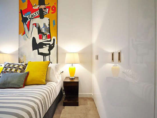 编辑点评:内嵌于墙壁的白色衣柜自然地融入整体,既节省了卧室空间也发挥着强大的收纳功能。床头位置用巨型艺术画作装饰,两侧对称摆放着颜色分层的圆凳子当床头柜使用,黑白红蓝等色彩的跳跃让卧室充满活力。
