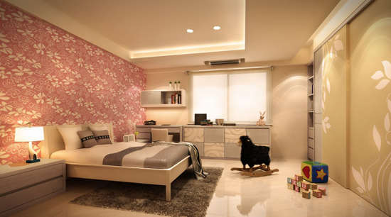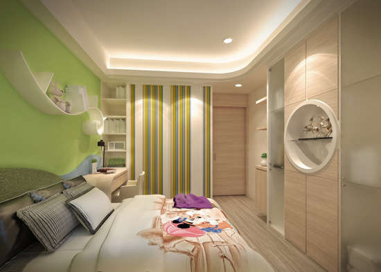 编辑推荐:相同的格局里,设计师运用壁纸、壁贴与木皮的分割变化小孩房氛围。